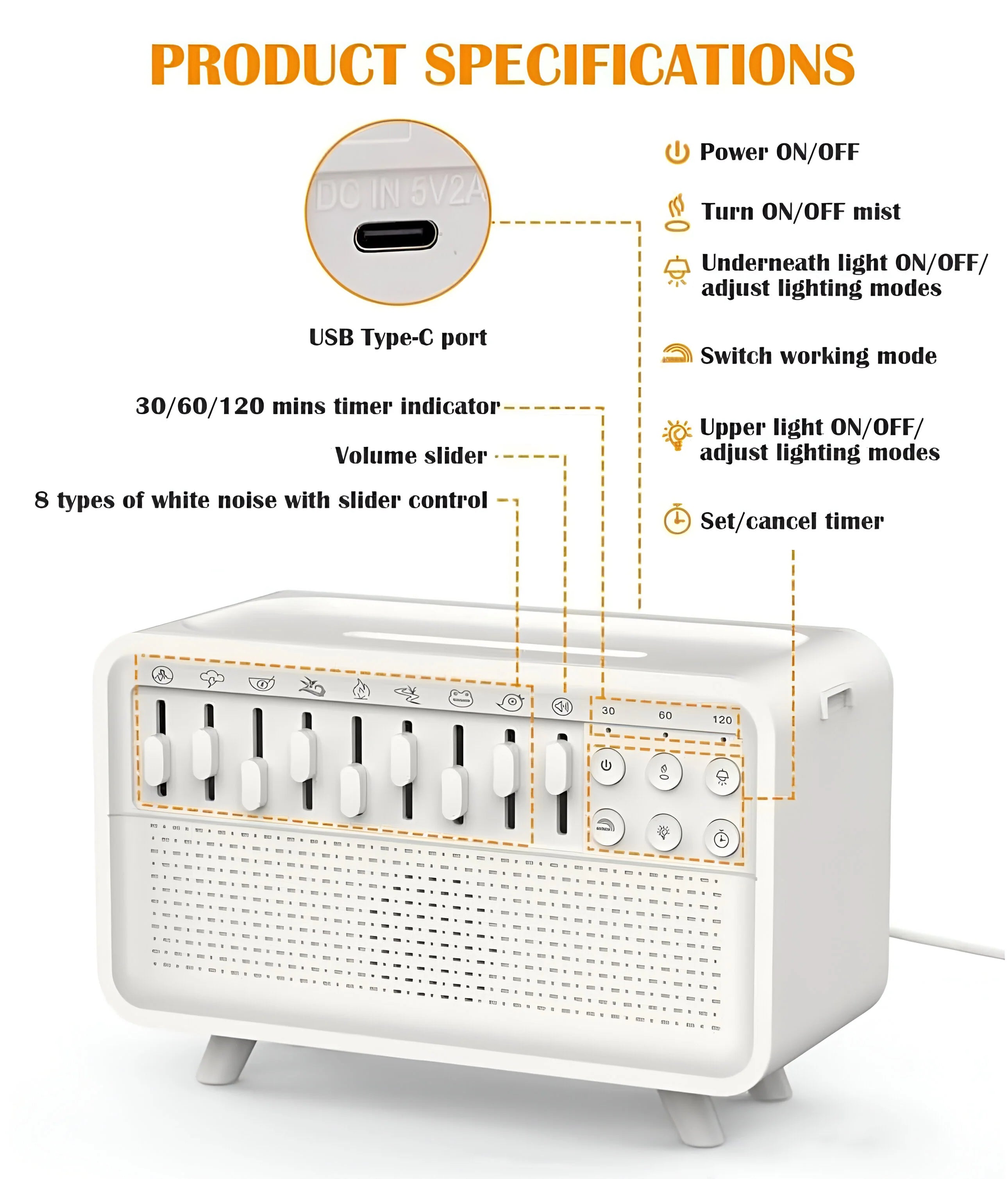 From customizable white noise and timer settings to dual lighting controls and mist functions, this sleep device offers precise functionality with an intuitive slider and button layout engineered for a personalized and effortless experience.